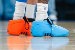 今天缺席比赛的杰伦·威廉姆斯在赛前也进行了常规训练。而他上脚了一双Adidas Crazy 2 “OKC” PE。球鞋采用了雷霆球衣配色的蓝橙鸳鸯配色。
